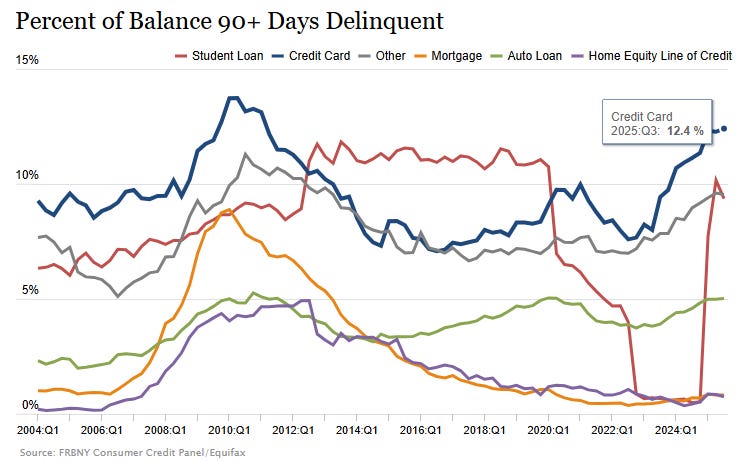 About 12.4 percent of credit card balances are 90 or more days delinquent—elevated compared with recent years and near levels seen during the Great Financial Crisis.