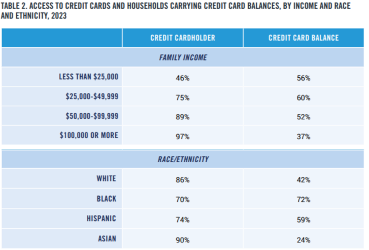 Lower-income households are less likely to have credit cards. When they do, they are more likely to carry balances, especially during emergencies. These households rely on flexible credit the most—and they are the first to lose access when lending standards tighten.