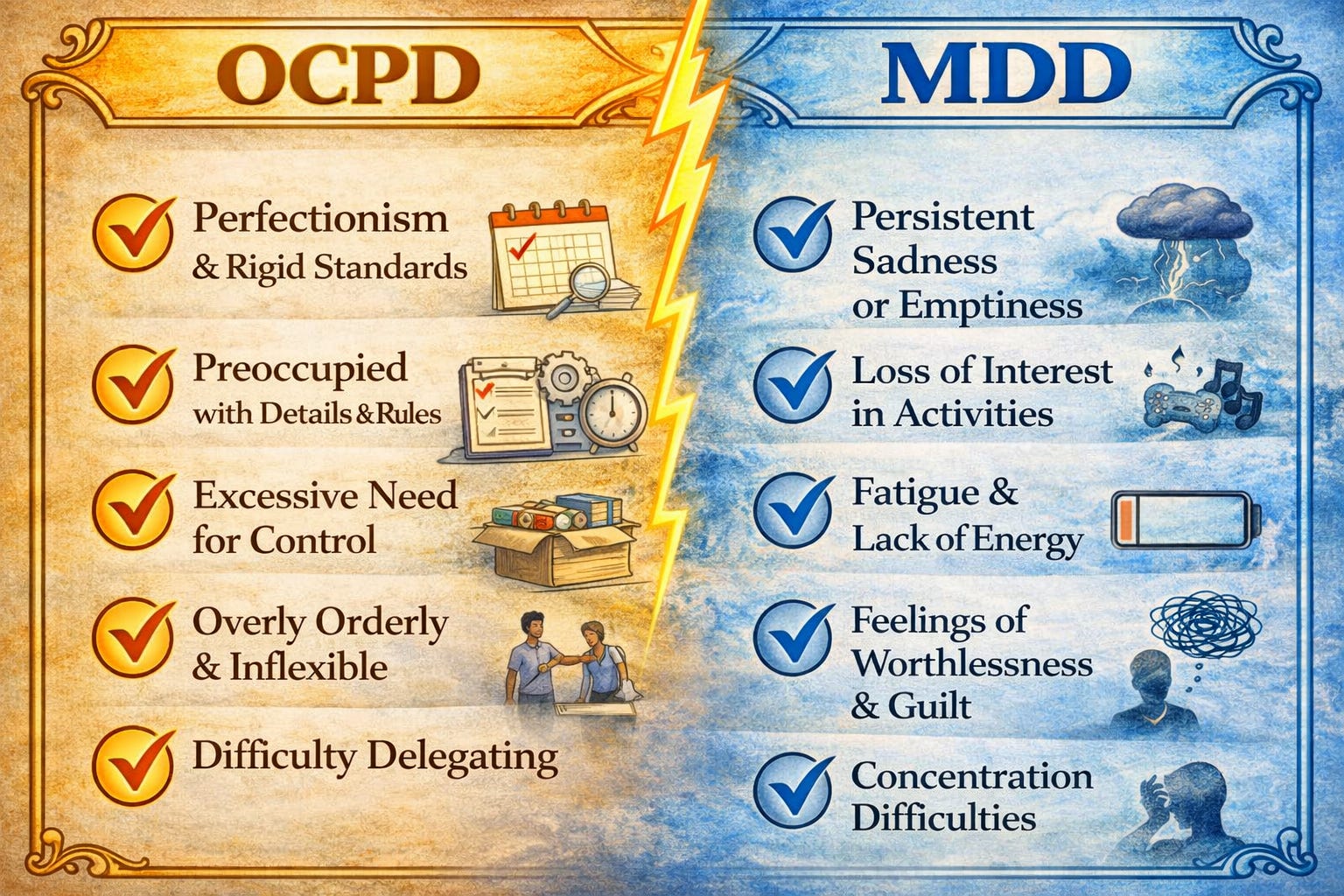OCPD can mean relentless perfectionism, rigidity, overwork, and a mind that won’t shut off. MDD can mean heaviness, discouragement, and stretches where everything feels harder than it should.