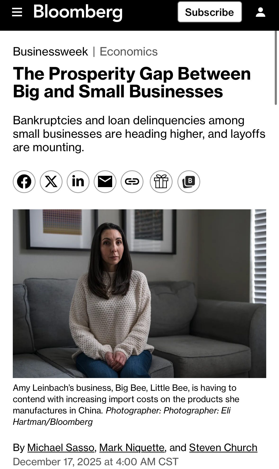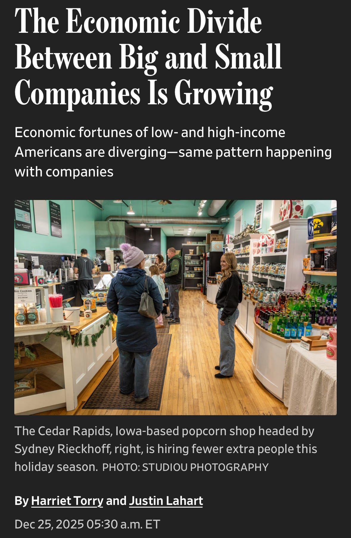 But two recent pieces—one from the Wall Street Journal and another from Bloomberg—tell a more sobering story beneath the surface. Together, they show a labor market that is quietly splitting into two economies: one where large firms thrive, and another where small businesses and many workers struggle to keep up.