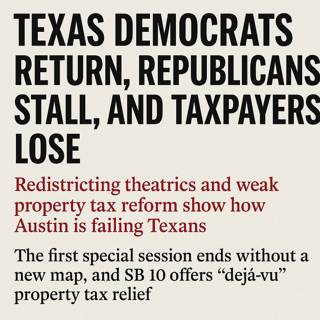 Texas Democrats Return, Republicans Stall, and Taxpayers LoseRedistricting theatrics and weak property tax reform show how Austin is failing Texans.Vance Ginn, Ph.D.Aug 19, 2025∙ Paid11ShareHello Friends!What happens when politicians in Austin put politics ahead of Texans? We just saw it play out.Let People Prosper is a reader-supported publication. To receive new posts and support my work, consider becoming a subscriber.SubscribeAfter two weeks of fleeing to Illinois, New York, and California, Texas House Democrats finally returned, letting the ch…Continue reading this post for free, courtesy of Vance Ginn, Ph.D..Claim my free postOr purchase a paid subscription.PreviousNext