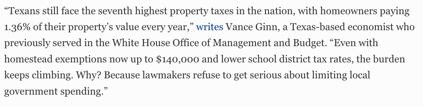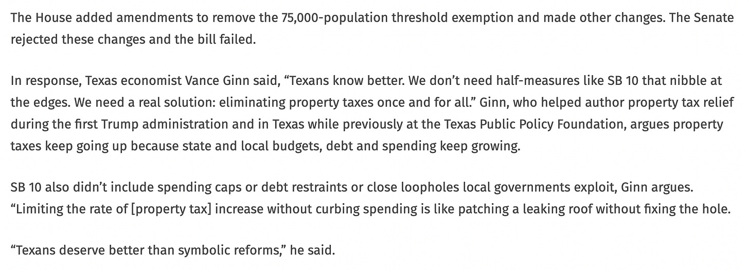 In a win for Texas taxpayers, the House rejected SB 10, which excluded smaller local governments from the new 2.5 percent voter-approval property tax rate and failed to cut property taxes. Texans deserve more than half-measures. The real solution is eliminating property taxes once and for all. I shared more on this with ABC 10.