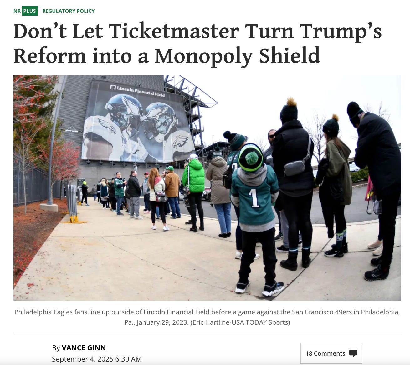 President Trump’s executive order to rein in the live entertainment market was a win for everyday Americans. But now Ticketmaster is pushing a resale price cap that limits tickets to just 20% above face value — a move I argue in National Review is designed to crush competitors under the guise of reform, and it will only make a broken system worse.