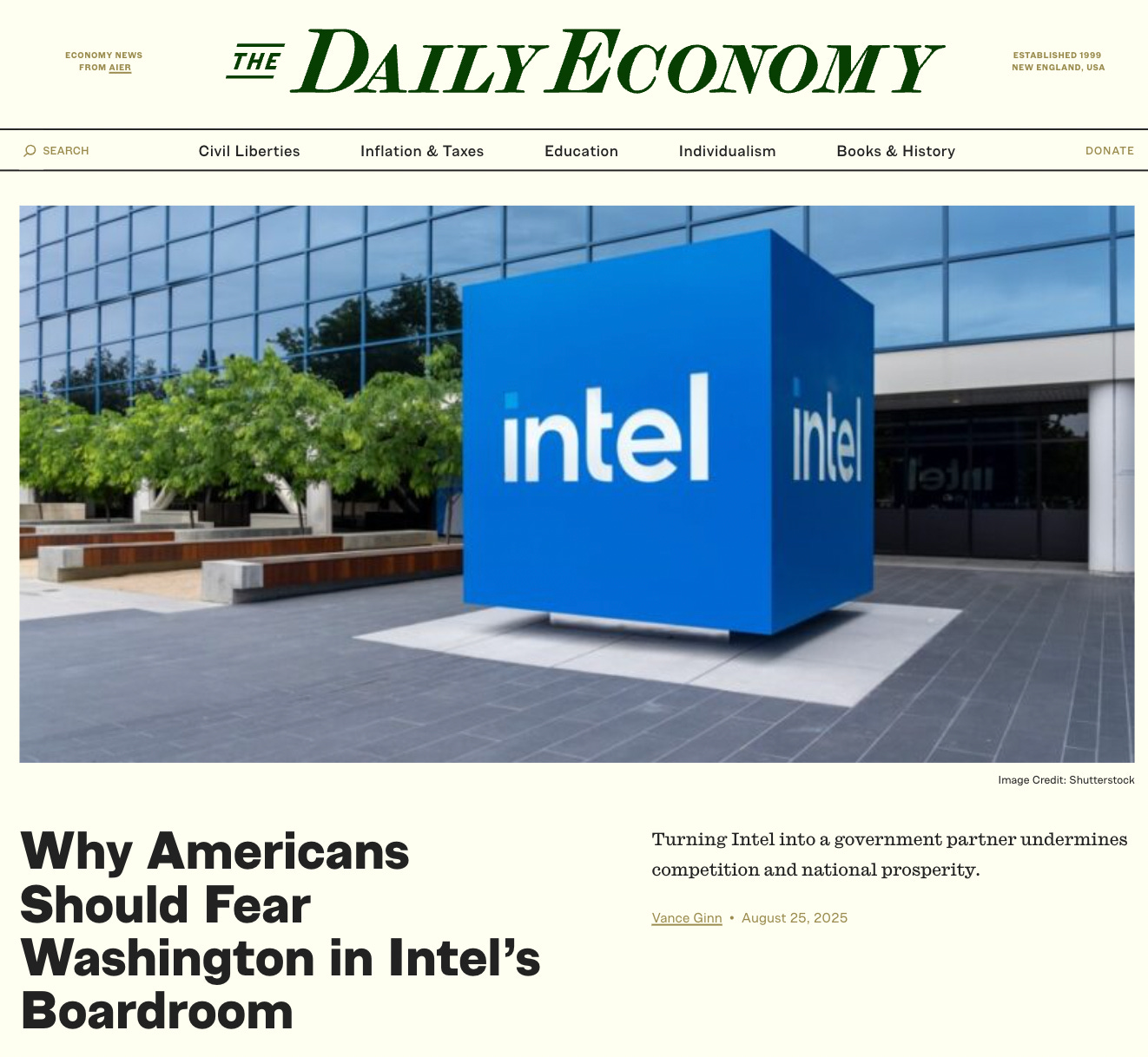 The Trump administration’s negotiations with Intel could make Washington one of the company’s largest shareholders. This isn’t just a one-off — it signals a broader shift. As I wrote in The Daily Economy, once government takes equity stakes in private firms, it stops acting as referee and starts competing as a player.