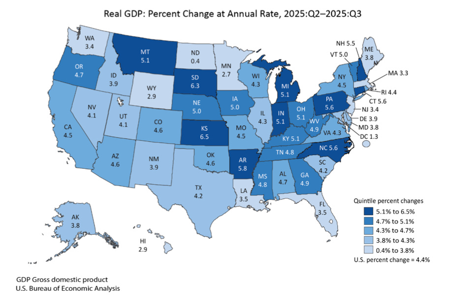 New state-level economic data from the latest jobs and GDP reports show a mixed but generally expanding economy. In December 2025, the national unemployment rate was 4.4%, with state rates ranging from 2.2% in Hawaii and South Dakota to 6.7% in the District of Columbia. In the third quarter of 2025, real GDP and personal income rose in all 50 states and the District of Columbia. Nationally, real GDP grew at an annual rate of 4.4%, led by Kansas at 6.5%, while North Dakota posted the slowest growth at 0.4%. Current-dollar personal income increased at a 3.3% annual rate nationwide, ranging from 6.3% in Kansas to just 0.1% in Louisiana. Sources: Bureau of Labor Statistics, Bureau of Economic Analysis